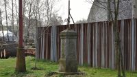 Před plotem z vlnitého plechu v trávě sokl s ulomeným zbytkem kříže.