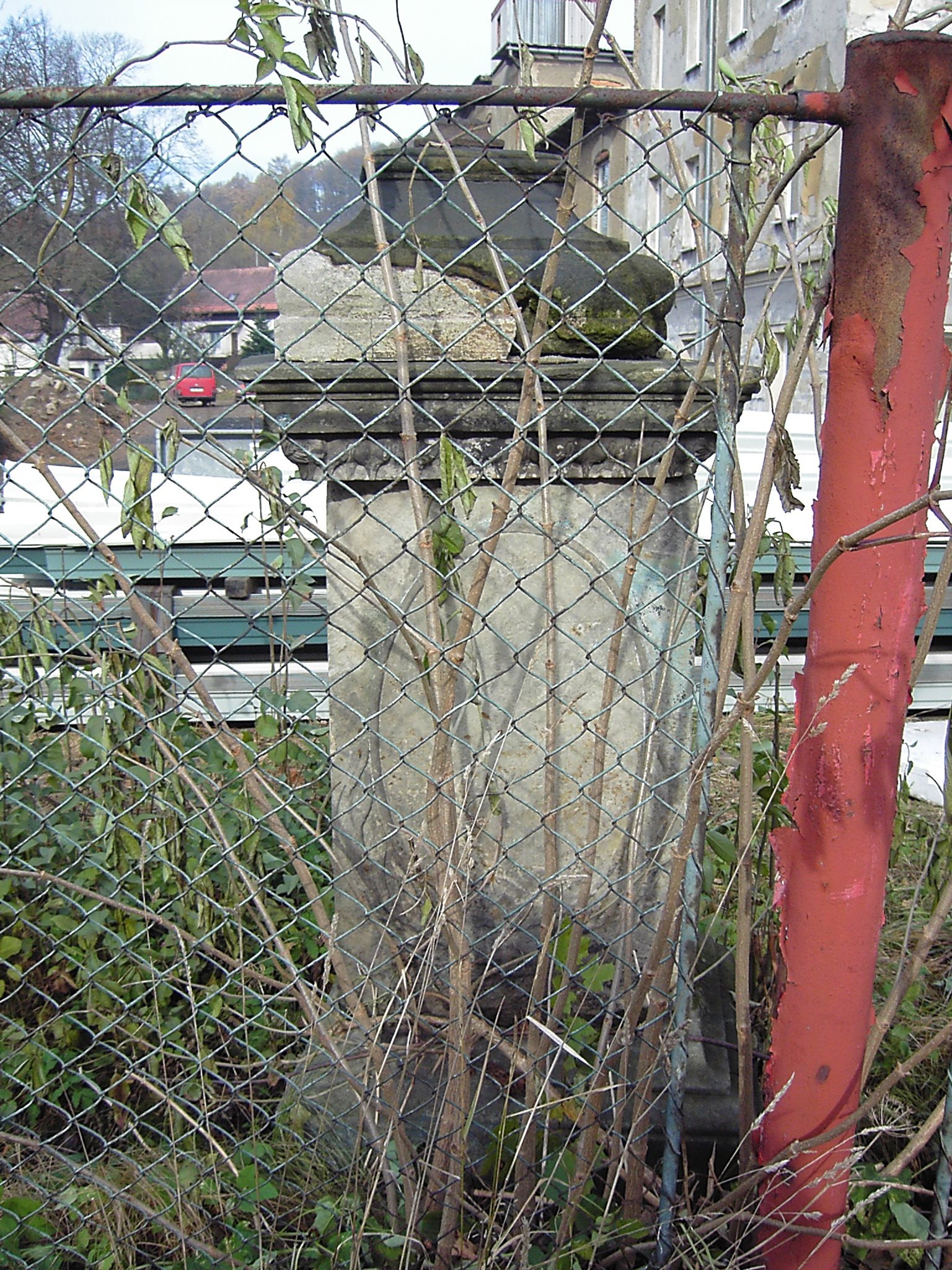 Mezi dlaždicemi, kterými je vyloženo prostranství ve vybrání plotu, čtvercová vyvýšená základna z několika kamenů, nesoucí stupňovitý sokl s hladkou zadní stranou. Kámen je silně poškozený, na mnoha místech se drolí, místy mech. Viditelné jsou nějaké opravy, ale tmel jiné barevnosti odpadává.