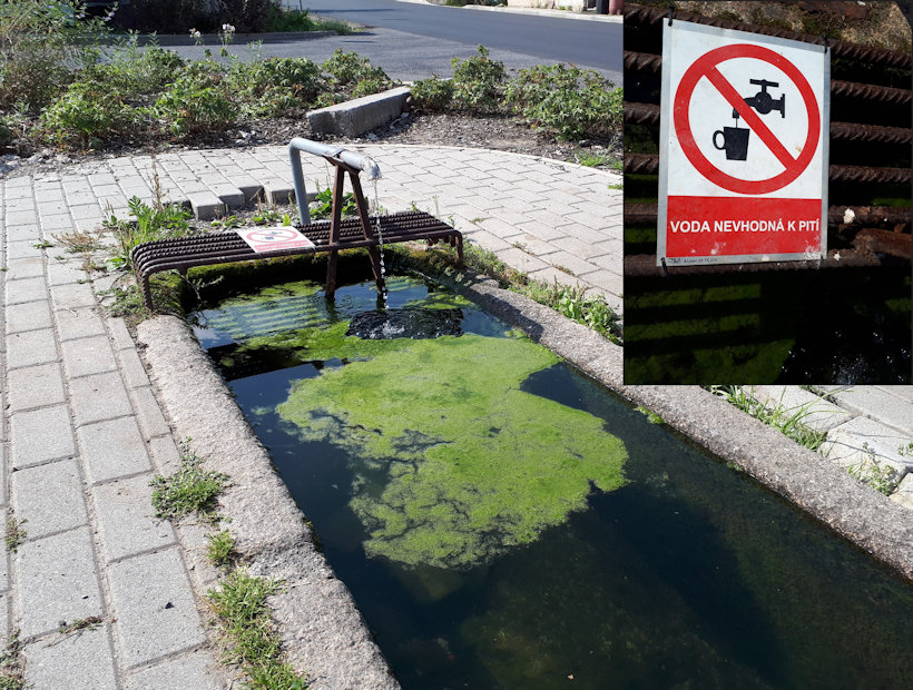 Dřevo na přístřešku trochu zašlo (snad i proto zadní vzpěry), kamenný sloupek je pryč. Je tu jen trubka, z níž vody teče plno. Zákaz používání nikde, ale že by tu stály fronty zájemců, to zrovna ne.