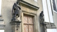 U vstupu do kostela svatého Václava ve Šluknově stojí dvojice světců, pohledově vlevo je umístěn svatý Pavel.